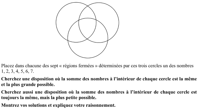 Placer dans les sept domaines déterminés par trois cercles un des nombres 1, 2, 3, 4, 5, 6, 7 de telle manière que la somme des nombres à l’intérieur de chaque cercle soit la même et la plus grande ou la plus petite possible.
