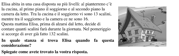 Oppure, considerare che con 13 + 16 = 29 scalini Elisa va dalla camera alla cucina e constatare che con 132 scalini fa volte (132 : 29) questo percorso (ritrovandosi quindi nuovamente in camera) e avanzano 16 scalini con i quali arriva in soggiorno.