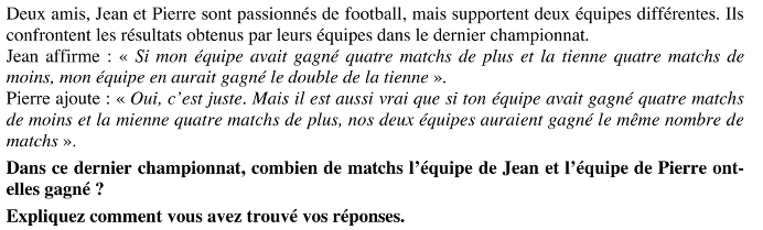 Ou bien : en langage algébrique, introduire des lettres pour représenter le nombre des matchs gagnés par les deux équipes. Par exemple, P pour l’équipe de Pierre et J pour l’équipe de Jean. Exprimer la seconde affirmation en écrivant J = P + 8. Chercher ensuite la valeur de P qui rend J + 4, c’est-à-dire P + 12, égal à 2 (P – 4). En déduire que 12 = P – 8, d’où P = 20. Conclure que J = 28.