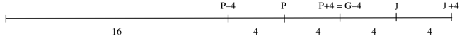 Ou bien : construire un schéma du type suivant, considérant que J + 4 est le double de P – 4 et qu’il y a 16 matchs de différence entre J + 4 et P – 4, du fait que J – 4 = P + 4 :