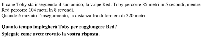 Trovare il tempo necessario, in secondi, affinché un primo “oggetto mobile” che si muove alla velocità di 85 m in 5 secondi raggiunga un secondo “oggetto mobile” che si muove alla velocità di 104 m in 8 secondi e che è partito con 320 m di vantaggio sul primo.
