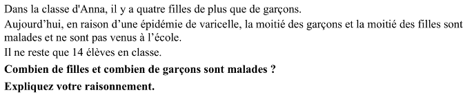- Raisonner en partant du nombre initial d'élèves (28 = 14 x 2). En soustrayant les 4 filles de plus de plus, on obtient le double du nombre de garçons (24 = 28 - 4). En déduire le nombre de garçons (12 = 24: 2) et celui des filles (16 = 12 + 4), puis le nombre garçons et de filles malades (la moitié des nombres précédents). Ce raisonnement peut aussi conduire à la suite de calculs : (28 – 4) : 2 = 12, 12 + 4 = 16, 12 : 2 = 6, 16 : 2 = 8.