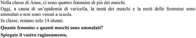 - Capire che in ognuna delle due metà di alunni, il numero delle femmine supera di due il numero dei maschi, poiché sottraendo 2 da 14 si ottiene due volte il numero dei maschi presenti. Di conseguenza, il calcolo (14 – 2) : 2 = 6 dà il numero dei maschi presenti e 6 + 2 = 8 il numero delle femmine presenti.