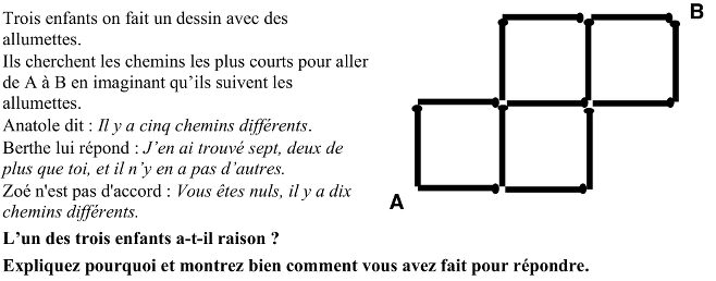 - Se rendre compte que, vu les avis divergents, l’enjeu du problème est de déterminer le nombre de chemins différents, après avoir constaté que les chemins les plus courts sont constitués de 5 allumettes : 3 horizontales et 2 verticales.