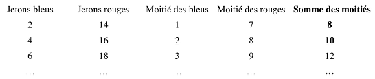 - Stratégie par inventaires des cas, par exemple en commençant l’énumération à 2 pour les jetons bleus et donc à 14 (2 + 12) pour les jetons rouges et vérification de la 2e condition (cette organisation peut apparaître, mais sans doute pas sous forme de tableau, par exemple :