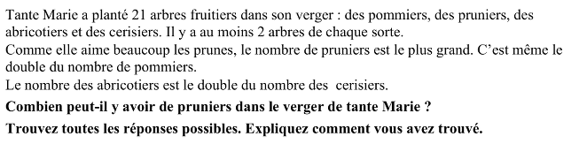 Ou, puisque le nombre de pruniers est le double du nombre de pommiers, le total de ces types d’arbres est un multiple de trois. Il en est de même pour le nombre d’abricotiers et de cerisiers. La somme de ces deux multiples de 3 doit être égale à 21. Les multiples de 3 inférieurs à 21 sont : 3 ; 6 ; 9 ; 12 ; 15 et 18. Par conséquent, les paires de nombres à considérer sont 3 (1 + 2) et 18 (12 + 6) ; 6 (2 + 4) et 15 (10 + 5) ; 9 (6 + 3) et 12 (4 + 8). La première paire n'est pas acceptable car il doit y avoir au moins deux arbres de chaque type.