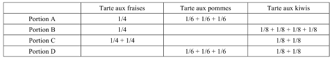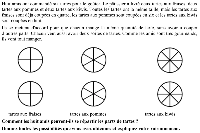 - Comprendre qu'il faut répartir les tartes en 8 portions égales en prenant, pour chaque portion, des parts dans deux tartes.
