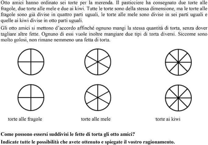 - Capire che bisogna suddividere le torte in 8 porzioni uguali, prendendo, per ogni porzione, delle fette da due torte.