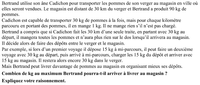 - Pour une étude plus systématique, comprendre que le poids des pommes mangées par Cadichon ne dépend pas de la charge qu’il porte, mais seulement de la distance parcourue. En déduire qu’il vaut mieux que Cadichon voyage en pleine charge de 30 kg et minimiser le nombre de ses trajets.