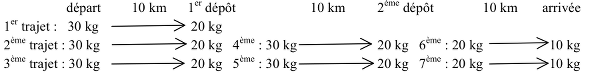 Optimiser un transport de 90 kg sur une distance de 30 km avec un transporteur de charge maximale un 30 kg consommant 1 kg par km.