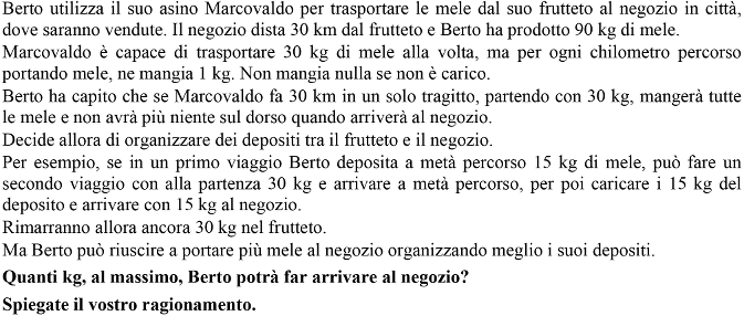 - Per depositare 60 kg di mele, Marcovaldo deve fare almeno tre viaggi. Per ottimizzare ne farà esattamente 3. Poiché Marcovaldo ha alla partenza 90 kg di mele da trasportare, può effettivamente fare ciò in 3 viaggi da 30 kg ciascuno. Per consegnare 60 kg di mele, l’asino può mangiare 30 kg di questi 90 kg in tre volte, cioè 10 kg per viaggio. La distanza che separa il frutteto dal primo deposito è allora di 10 km (soluzione ottimale).