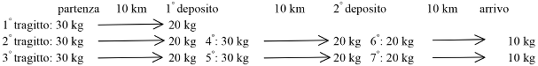 Ottimizzare un trasporto di 90 kg su una distanza di 30 km con un trasportatore che sopporta un carico massimo di 30 kg e che consuma 1 kg per km.
