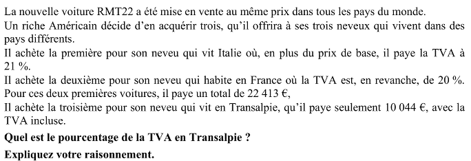 Ou bien, utiliser une équation de la forme x + 0,21x + x + 0,20x = 22 413 ou 1,21x + 1,20x = 22 413 et en déduire que x = 9300 € est le prix d’une voiture, puis pour trouver la TVA de Transalpie (y), résoudre l’équation 9300 (1 + y) = 10 044 d’où y = 0,08 ou 8 %