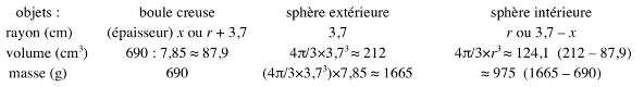 - Comprendre et se représenter les relations entre les rayons, les volumes et les masses des trois objets en présence : la boule de pétanque creuse, la sphère extérieure, la sphère intérieure, ces deux dernières pouvant être hypothétiquement considérées comme pleines pour les besoins des calculs de masses.