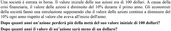 - Il calcolo del numero di anni alla fine dei quali il valore dell’azione sarà meno di un dollaro risulta fastidioso. Osservare, per accelerare i calcoli, che per ottenere il valore alla fine dell’anno k occorre moltiplicare il valore all'inizio dell'anno k per 0,9.