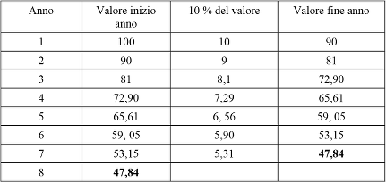 - Se V = 100 dollari è il valore iniziale dell’anno 1, allora il valore alla fine dell’anno è 100 x 0,9, dopo due anni 100 x (0,9)2 dollari, … alla fine di k anni 100 x (0,9)k dollari.