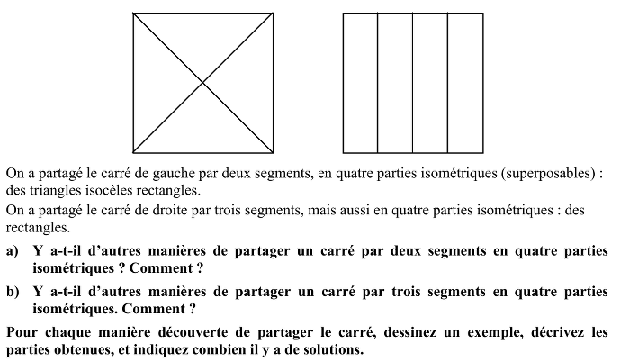 Partager un carré par deux segments en quatre parties isométriques puis par trois segments en quatre parties isométriques.