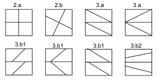 Avec 3 segments : 1 solution donnant 4 rectangles (exemple), 1 solution donnant 4 triangles rectangles (fig. 3a) et une infinité de solutions donnant quatre trapèzes rectangles qu’on pourrait encore subdiviser en deux catégories, de hauteur 1/2 (fig. 3.b1) ou de hauteur 1 (fig. 3.b2).