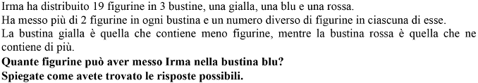 - Per tentativi, dedurre dal testo che il più piccolo numero di figurine nella bustina gialla è almeno 3, nella blu è almeno 4 e nella rossa è al massimo 12. Rendersi conto anche, eventualmente, che si possono organizzare le somme legandole ai tre colori, nell’ordine giallo, blu, rosso, o concentrando l’attenzione solo sulla bustina blu.