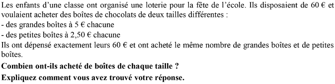 - Ou observer que le coût d’une grande boîte est le double du coût d’une petite boîte, et donc comprendre qu’en divisant la dépense totale par 3, on obtient la dépense pour les petites boîtes (60 : 3 = 20), puis la dépense pour les grandes boîtes (20 × 2 = 40). Conclure que qu’il y a 8 petites boîtes (8 = 20 : 2,5) et 8 grandes boîtes (8 = 40 : 5).