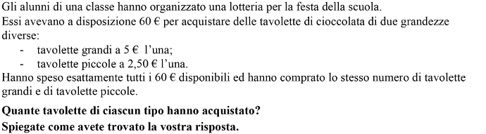 - Se si considerano separatamente i termini 2,5 e 5 osservare eventualmente che saranno necessarie da 1 a 11 tavolette grandi, o da 1 a 23 tavolette piccole, per arrivare ad una spesa di 60 € e trovare la soluzione per tentativi successivi organizzati.