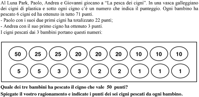 - Per esempio, rendersi conto che Paolo, avendo totalizzato in due pescate 22 (20 + 2) punti, deve avere fatto 49 (71 – 22) con le altre quattro pescate e che c’è un’unica possibilità per ottenere tale numero con i numeri dati: 25 + 20 + 3 + 1. Eliminare i punteggi 20 – 2 – 25 – 20 – 3 – 1 già attribuiti a Paolo e il 3 pescato da Andrea. Considerare che ad Andrea servono 68 punti da realizzare con 5 pescate. Rendersi conto che c’è un unico modo, con i numeri rimasti, di ottenere 68 come somma di cinque addendi: 50 + 10 + 5 + 2 + 1. Quindi i punteggi per Andrea sono: 3 – 50 – 10 – 5 – 2 – 1 ed è Andrea che ha pescato il cigno da 50 punti.