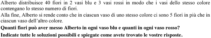 - per tentativi successivi, scegliere un numero di fiori in uno dei due tipi di vaso, calcolare il numero di fiori nell’altro tipo partendo dal fatto che il numero totale di fiori è 40, poi verificare se la differenza è 5;