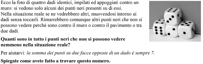 A partire da una foto che mostra quattro dadi impilati contro una parete, trovare il numero di punti neri non visibili ad un osservatore che può muoversi attorno ai dadi.