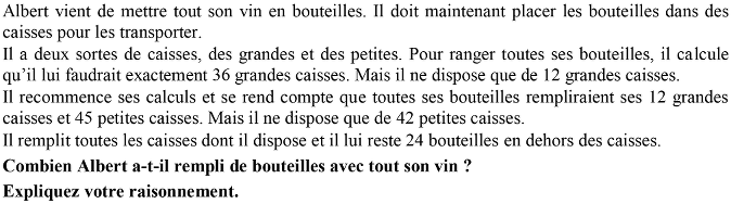 Par exemple, se rendre compte que les 24 bouteilles restantes en dehors des caisses iraient dans les trois petites caisses manquantes (45–42). Comprendre ainsi que dans une petite caisse entrent exactement 8 bouteilles et que le nombre de bouteilles qu’Albert devrait mettre dans les 45 petites caisses est 360 (= 45 × 8). Comprendre que 360 est le même nombre de bouteilles qu’Albert aurait dû ranger dans 24 (= 36–12) grandes caisses et en déduire que chacune des grandes caisses contient 15 (= 360 : 24) bouteilles.