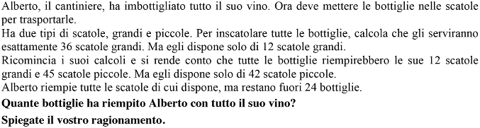 Per esempio, rendersi conto che le 24 bottiglie rimaste da imballare andrebbero nelle 3 (= 45 − 42) scatole piccole mancanti. Comprendere così che in una scatola piccola entrano esattamente 8 bottiglie e che il numero di bottiglie che Alberto dovrebbe mettere nelle 45 scatole piccole è 360 (= 45 × 8). Capire che 360 è anche il numero di bottiglie che Alberto avrebbe dovuto imballare in 24 (= 36 −12) scatole grandi e ricavare così che ogni scatola grande contiene 15 (= 360 : 24) bottiglie.