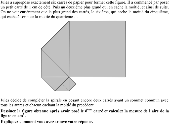 - La somme à calculer, en cm2, est donc 1 + 2 + 4 + 8 + 16 + 32 + 128 ; on obtient 191 cm2.