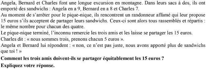 - Répartir 15 euros en trois parts correspondant à 3 ; 2 ; 1 : sur les 6 sandwichs donnés à l’inconnu, Angela en a donné 3 et doit avoir les 3/6e de 15 € soit 7,50 €, pour Bernard les 2/6e soit 5 € et pour Charles le 1/6e, soit 2,50 €. (Il faut rejeter les solutions qui se limitent à maintenir égaux les écarts et la somme 15 comme 6 ; 5 ; 4, ou 7 ; 5 ; 3 ou 8, 5, 2 etc. et penser à un partage qui respecte les rapports de proportionnalité).