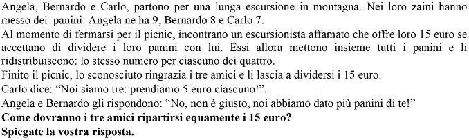 - Ripartire 15 euro in tre parti corrispondenti ai numeri 3; 2; 1: su 6 panini dati allo sconosciuto, Angela ne ha dati 3 e deve avere i 3/6 di 15 €, cioè 7,50 €, Bernardo i 2/6, cioè 5 €, e Carlo 1/6, cioè 2,50 €.