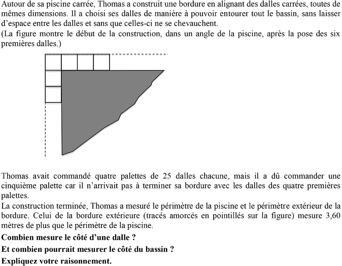 - Pour répondre à la deuxième question sur la mesure du côté de la piscine, à partir du « 0,45 » obtenu précédemment, comprendre qu’il faut utiliser les données sur le nombre de dalles (pour se restreindre à quelques solutions seulement) et que le nombre des dalles se situe entre 101 et 125. On peut procéder par essais ou tenir compte du fait que le nombre total des dalles est un multiple de 4 : 104, 108, 112, 116, 120, 124 ; et que sans les dalles des sommets on peut avoir 25, 26, 27, 28, 29, 30 dalles par côté, donc les longueurs des côtés de la piscine peuvent être (en m) : 11,25 ; 11,70 ; 12,15 ; 12,60 ; 13,05 et 13,50.