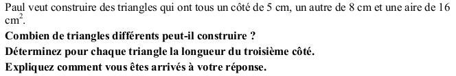 Déterminer le nombre de triangles que l’on peut construire, connaissant la longueur de deux des côtés et leur aire. Déterminer la longueur du troisième côté.