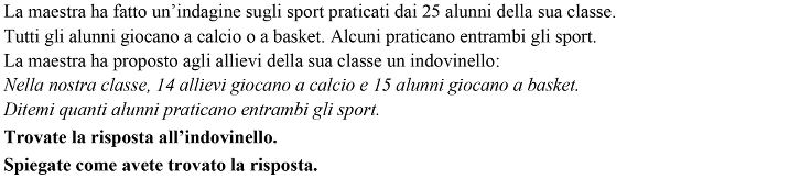 - Comprendere che se nessun allievo praticasse entrambi gli sport, il numero degli allievi della classe sarebbe uguale a 29 (14 + 15). Dedurne che 4 allievi (29 – 25) praticano entrambi gli sport. Verificare che 10 + 11 + 4 = 25.