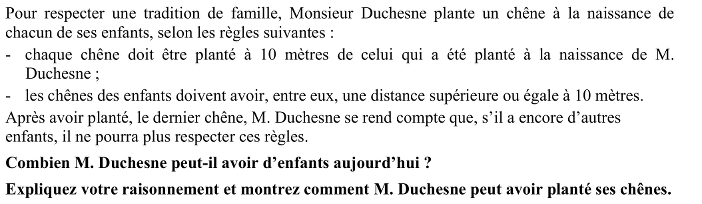 - Se rendre compte que 4 chênes pourraient avoir épuisé l’espace à disposition (par exemple s’ils sont plantés aux sommets d’un carré qui laisse 4 arcs de 90 degrés.) et qu’il en va de même pour 5 chênes.