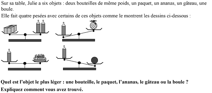 Déterminer parmi six objets différents quel est le plus léger en effectuant des déductions à partir de plusieurs pesées traduisant soit l’égalité, soit l’inégalité des masses de certains de ces objets, en utilisant entre autres la transitivité.