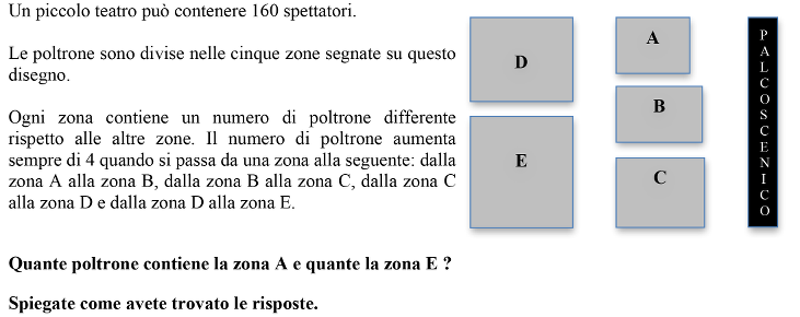 Considerare il numero di poltrone che nelle zone successive supera quello della prima zona (4 + 8 + 12 + 16 = 40 poltrone). Togliendo queste poltrone (ne restano 120), si ottengono 5 zone uguali. Dedurre, quindi, che la prima contiene 24 poltrone (120 : 5 = 24) e l’ultima 40.
