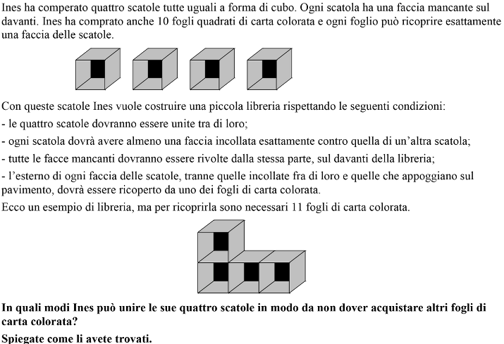Disegnare tutti i possibili solidi ottenuti unendo faccia contro faccia quattro scatole cubiche aventi ciascuna cinque facce, orientate allo stesso modo, poi contare le facce “visibili” esterne di ogni solido costruito, che non devono essere più di 10.