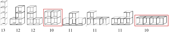 - Ricerca a caso dei possibili assemblaggi dei cubi (assemblaggio di quadrati o rappresentazione in prospettiva) tenendo conto del numero delle facce a contatto con il suolo.