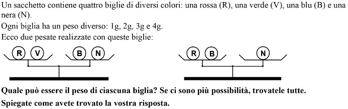 Determinare il peso di quattro biglie utilizzando i dati numerici relativi ai pesi e le uguaglianze ottenute interpretando l’equilibrio di due pesate con una bilancia a due piatti.
