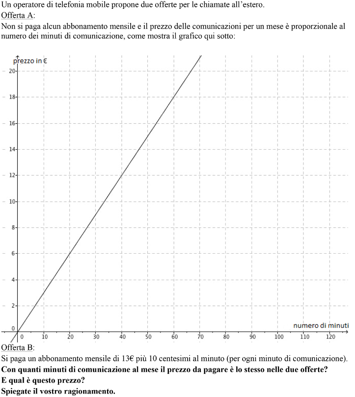- Un primo modo di trovare la soluzione è di procedere per tentativi sistematici, per esempio per mezzo di una tabella che presenti i prezzi da pagare in ogni offerta per la stessa durata. Si constata allora che fino a 60 minuti l’offerta A è più vantaggiosa, mentre, oltre i 70 minuti è più vantaggiosa l’offerta B, e che il prezzo comune deve quindi situarsi tra i 60 e i 70 minuti individuando poi la risposta corretta: 65 minuti.
