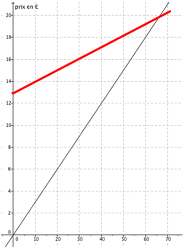 - Per via grafica, per esempio scrivere alcune coppie di valori dell’offerta B sul grafico, constatare che sono allineati e tracciare la retta corrispondente. Si trova così il punto di intersezione delle due rette, che ha per coordinate (65 ; 19,5). Naturalmente poiché in ordinata il punto 19,5 non è esattamente individuabile occorre effettuare la verifica aritmetica.