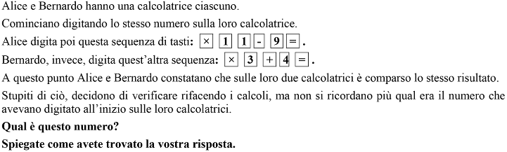 - Comprendere che sulle due calcolatrici è stato digitato uno stesso numero e che dopo aver effettuato due diverse sequenze di calcoli, una su una calcolatrice e una sull’altra, si ottengono come risultati due numeri uguali.