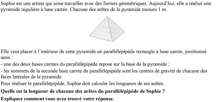 Déterminer les longueurs des arêtes d'un prisme à base carrée inscrit dans une pyramide régulière à base carrée dont toutes les arêtes mesurent 1 mètre. La base du prisme est contenue dans la base de la pyramide et quatre de ses sommets sont les centres de gravité des faces de la pyramide.
