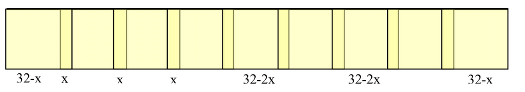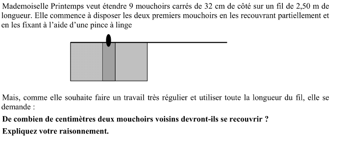- Observer que, s’ils ne se recouvraient pas, les mouchoirs occuperaient une longueur de fil de 288 (9x32), en cm, et que la différence 38 (288 – 250) doit être distribuée sur les huit recouvrements de chacun 4,75 (38 : 8), en cm.