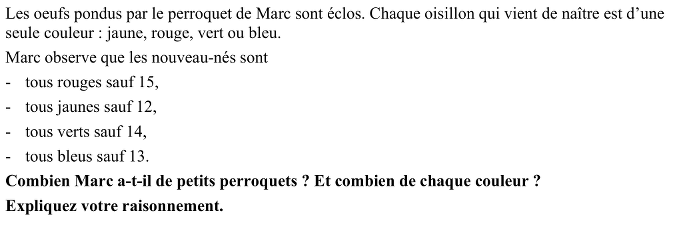 - résoudre le système par substitutions successives, ou se rendre compte qu’en additionnant membre à membre on obtient : 3(R+V+G+B) = 15+12+14+13 = 54 et en déduire par conséquent que le nombre total des petits perroquets est 18 (54 :3).