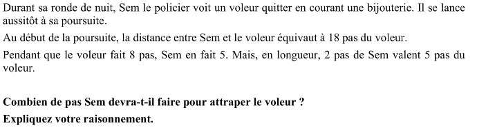 Calculer le nombre de grands pas que devra faire SEM pour rattraper un voleur à 18 petits pas de lui qui s'enfuit à petits pas. 2 grands pas valent 5 petits, mais le voleur faits 8 (petits) pas pendant que Sem fait 5 (grands) pas.