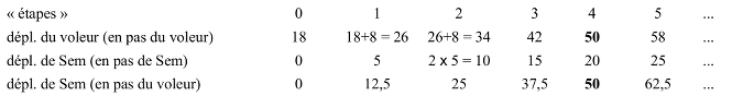 et finalement, comparer les déplacements de Sem et du voleur dans la même unité (lignes 2 et 4 du tableau) pour s’apercevoir que Sem rejoint le voleur après 50 pas du voleur, c’est-à-dire 20 pas de Sem.
